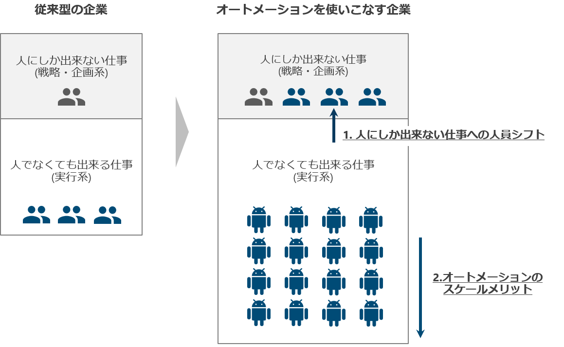 オートメーションを使いこなす企業では、それまで10人かけてやっていたような仕事を1人でやるようになり、更にその生産性はオートメーションのスケールにより従来をはるかに凌ぎます。